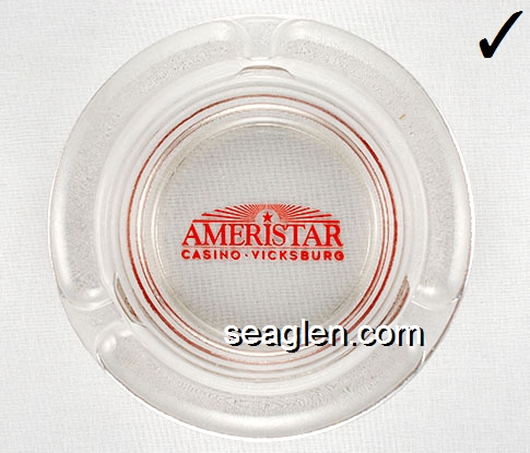 AMV-A1 Ameristar Casino (Vicksburg) Vicksburg, MS 4 1/2" Clear Glass Ashtray Red imprint: Ameristar Casino - Vicksburg |