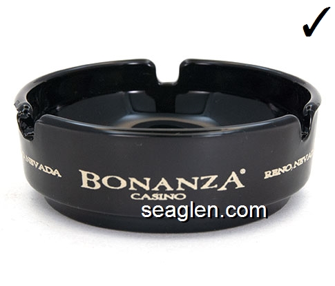 BON-N1 Bonanza Hotel Las Vegas, NV 3 1/2" Smoke Glass Ashtray White and gray imprint: Las Vegas, Bonanza Hotel, Nevada (Like BON-02, except smooth bottom) |