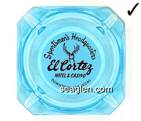 ELC-43 El Cortez Hotel & Casino Las Vegas, NV 3 1/2" Blue Glass Ashtray Red on white imprint: Sportsmen's Headquarters, El Cortez Hotel & Casino, Downtown Las Vegas |