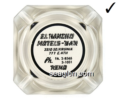 ELD-C4 Eldorado Hotel & Casino Reno, NV 3 1/2" Clear Glass Ashtray Black on white imprint: Eldorado, Toll Free 800-648-3076, Hotel & Casino Reno (Like ELD-11, except clear glass) |