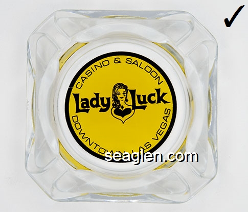 LLC-F1 Lady Luck Casino Las Vegas, NV 3 1/2" Clear Glass Ashtray Black on yellow imprint: Casino & Saloon, Lady Luck, Downtown Las Vegas |