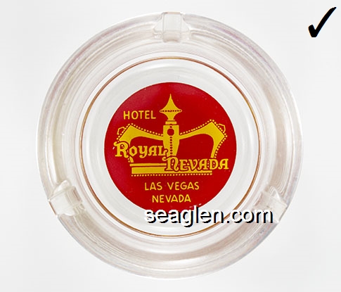 RNV-B1 Royal Nevada Las Vegas, NV 5" Clear Glass Ashtray Yellow on red imprint: Home of the Dancing Waters, Hotel Royal Nevada, Las Vegas, Nevada (SAFEX style) |