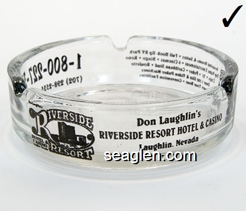 RVR-B2 Riverside Resort & Casino Laughlin, NV 3 11/16" Clear Glass Ashtray Black imprint: Don Laughlin's Riverside Resort Hotel Casino, Laughlin Nevada, ... Pools - 900-Space Full Hook-Up RV Park - Top Name Entertainment |