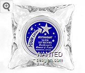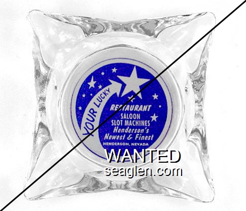 LSH-B1 Lucky Star Club ?" Clear Glass Ashtray "Your Lucky (Star) Restaurant, Saloon, Slot Machines, Henderson's Newest & Finest, Henderson, Nevada" - White on blue |