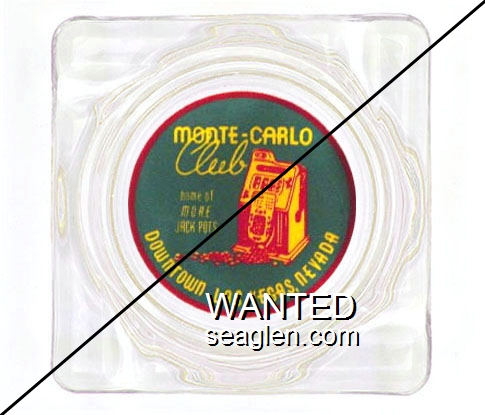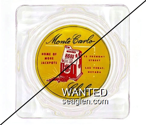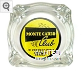 MCV-A3 Monte Carlo Club 4 1/4" Clear Glass Ashtray "Monte Carlo Club, Home of More Jackpots, 15 Fremont Street, Las Vegas, Nevada" - Black and red on yellow |