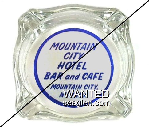 MCY-A1 Mountain City Hotel 3 7/16" Clear Glass Ashtray "Mountain City Hotel, Bar and Cafe, Mountain City, Nevada" - Blue on white |