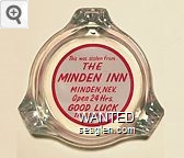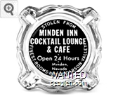 MND-B1 Minden Inn 3 11/16" Clear Glass Ashtray "Stolen From Minden Inn Cocktail Lounge & Cafe, Open 24 Hours, Minden, Nevada, Finest Rooms in the Carson Valley" - White on black |