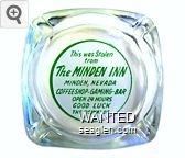 MND-D1 Minden Inn 3 1/4" Clear Glass Ashtray "This was Stolen from The Minden Inn, Minden, Nevada, Coffeeshop - Gaming - Bar, Open 24 Hours, Good Luck, The Oswalds" - Green on white |