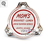 MOM-A1 Mom's 3 1/4" Clear Glass Ashtray "Mom's, Breakfast - Lunch, Bar & Fountain Service, Austin, Nevada" - Red on white |