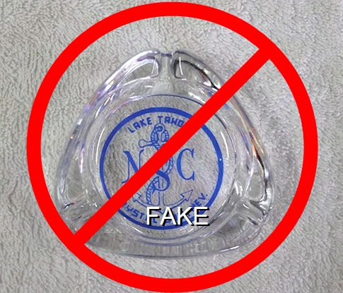 NSC-91 North Shore Club Hotel 3 1/2" Clear Glass Ashtray "Lake Tahoe, NSC, Crystal Bay, Nev." - Blue (A silk screened fake, sold on eBay by seller greencOkecollector) |
