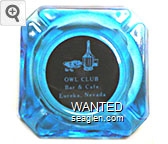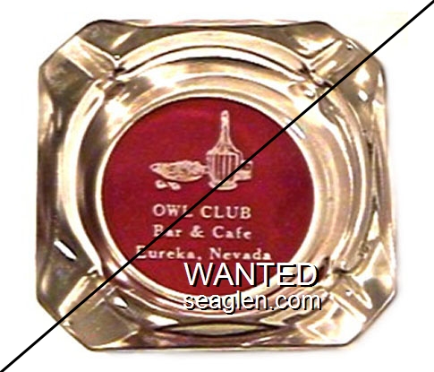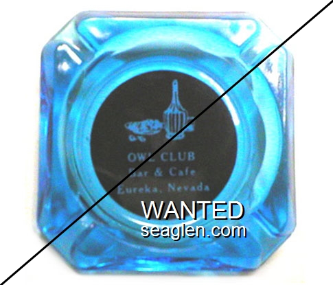 OWL-B2 Owl Club 3 1/2" Blue Glass Ashtray "Owl Club, Bar & Cafe, Eureka, Nevada" - White on red |