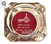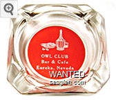 OWL-A5 Owl Club 3 1/2" Clear Glass Ashtray "Owl Club, Bar & Cafe, Eureka, Nevada" - White on red |