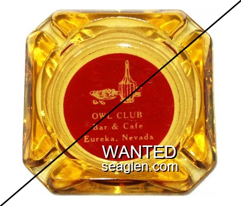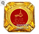 OWL-B1 Owl Club 3 1/2" Amber Glass Ashtray "Owl Club, Bar & Cafe, Eureka, Nevada" - White on red |