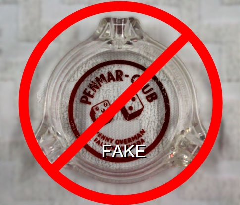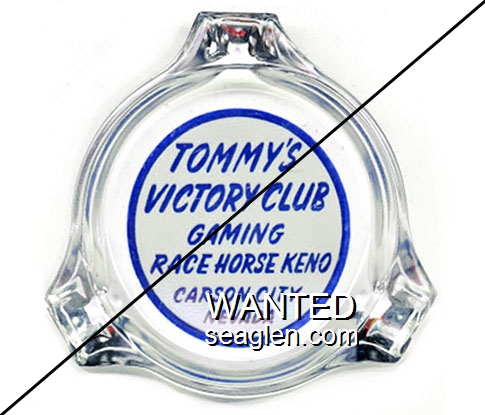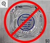 VIC-91 Victory Club 4" Clear Glass Ashtray "Tommy's Victory Club, Gaming, Racehorse Keno, Carson City Nevada" - Blue silkscreen (A silk screened fake, sold on eBay by seller greencOkecollector) |