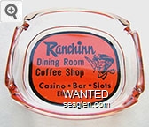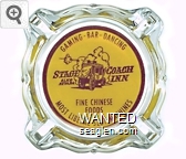 SCI-A2 Stagecoach Inn (Elko) 3 11/16" Clear Glass Ashtray "Gaming - Bar - Dancing, Stage Coach Inn, Elko Nevada, Fine Chinese Foods, Most Liberal Slot Machines" - Red on yellow |