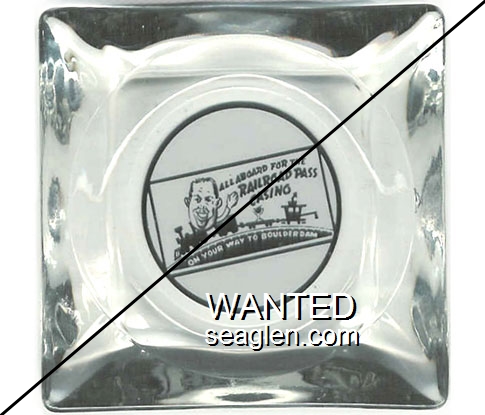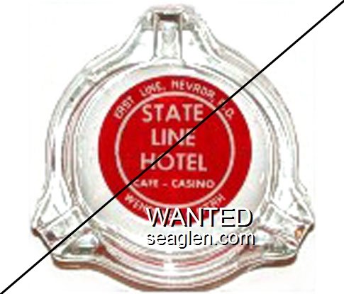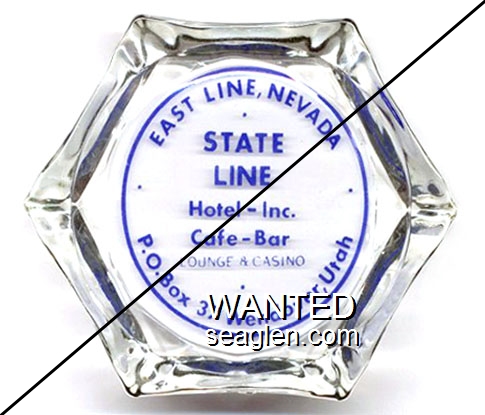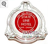 SLH-G1 State Line Hotel & Casino 4" Clear Glass Ashtray "East Line, Nevada P.O., State Line Hotel, Cafe - Casino, Wendover, Utah" - White on red |