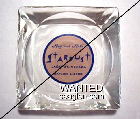 RRS-A1 Stardust, Ray and Ruth's 3 1/2" Clear Glass Ashtray "Ray and Ruth's Stardust, Jackpot, Nevada, SKyline 5-4288" - Blue on pink |