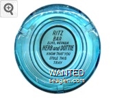 OVB-A1 Overland Bar 3 1/4" Clear Glass Ashtray "Overland Bar, Where Good Friends Meet, Phone 2-1221, 244 No. Center, Reno, Nev." - Red on blue |