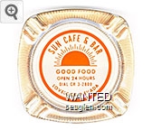 SBL-C2 Sun Bar 4 1/8" Clear Glass Ashtray "Sun Cafe & Bar, Good Food, Open 24 Hours, Dial CR.3-2156, Lovelock, Nevada" - Orange on blue |