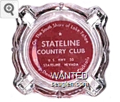 SCC-Q2 Stateline Country Club 3 11/16" Clear Glass Ashtray "On the South Shore of Lake Tahoe, Stateline Country Club, U.S. Hwy. 50, Stateline, Nevada, Dining - Dancing - Gaming - Cocktails" - White on red (Imprint has no scalloped outline) |
