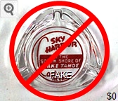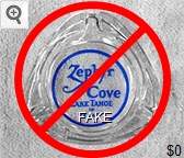 ZEP-91 Zephyr Cove Lodge 3 1/2" Clear Glass Ashtray "Zephyr Cove, Lake Tahoe in Nevada" - Blue on white (A silk screened fake, sold on eBay by seller greencOkecollector) |