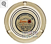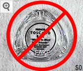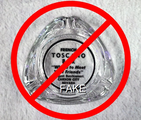 TOS-91 Toscano Bar 3 1/2" Clear Glass Ashtray "French Toscano Bar, ''Where to Meet Your Friends'', August Bucchianeri, Carson City, Nevada" - Black silkscreen (A silk screened fake, sold on eBay by seller greencOkecollector) |