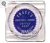 TCY-A1 Tracy's 4 1/4" Clear Glass Ashtray "Tracy's Cocktails - Gaming, Coffee Shop, Lovelock, Nevada" - White on blue |