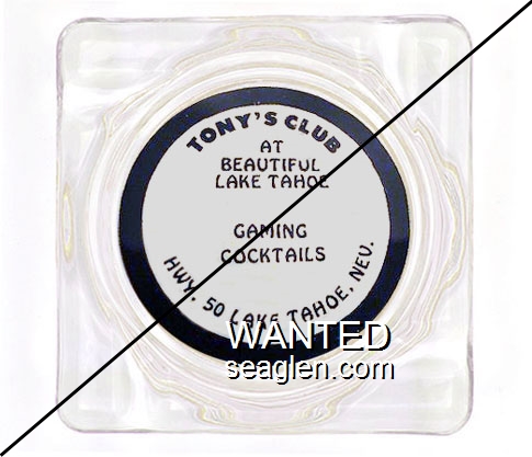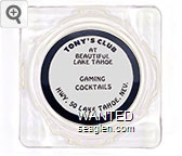 TNY-B1 Tony's Bar 4 1/4" Clear Glass Ashtray "Tony's Club at Beautiful Lake Tahoe, Gaming, Cocktails, Hwy. 50, Lake Tahoe, Nev." - Black on white |