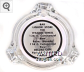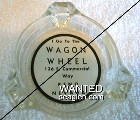 WWL-B1 Wagon Wheel 3 1/4" Clear Glass Ashtray "Bar, Liquor Store, The Wagon Wheel, 136 E. Commercial Row, Reno, Nevada, 116 E. Commercial Row, Deluxe Cafe, Famous Chinese Foods" - Black on white |