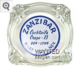 ZAN-02 Zanzibar 3 7/16" Clear Glass Ashtray "Zanzibar, Cocktails, Craps - 21, Don - Lynn, N. Las Vegas, Nev" - Blue on white |