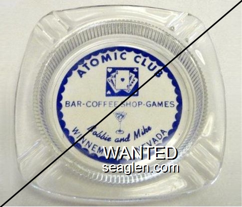 ACW-A1 Atomic Club Winnemucca, NV 4 1/8" Clear Glass Ashtray Blue on white imprint: Atomic Club, Bar - Coffee Shop - Games, Bobbie and Mike, Winnemucca, Nevada |