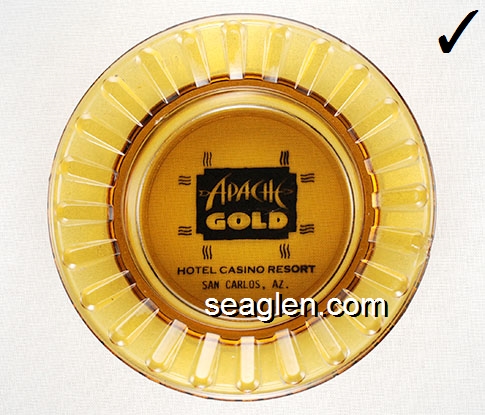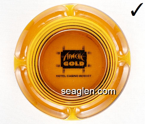 AGC-B1 Apache Gold Hotel Casino San Carlos, AZ 4 1/2" Amber Glass Ashtray Black imprint: Apache Gold, Hotel Casino Resort, San Carlos, AZ. |