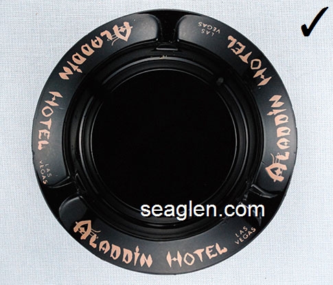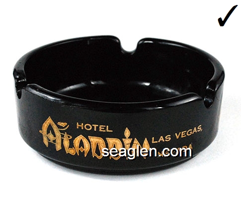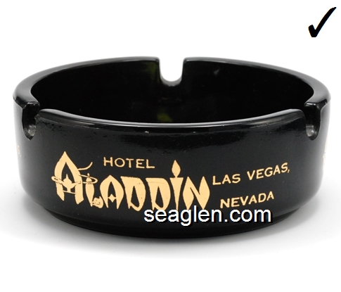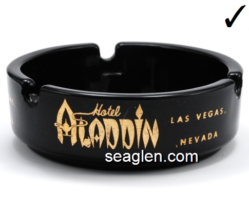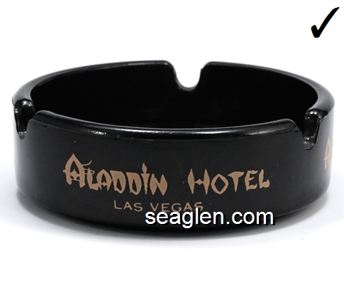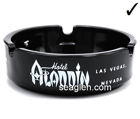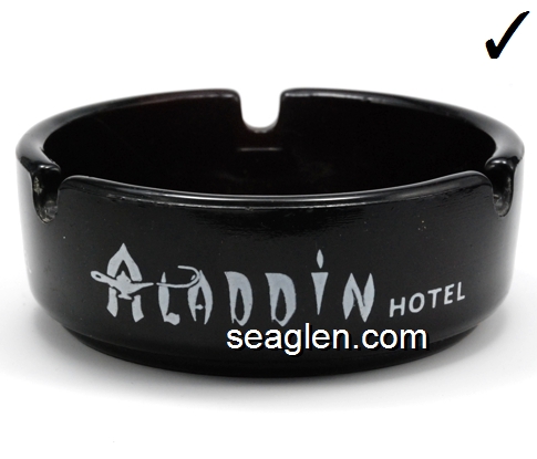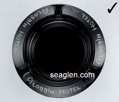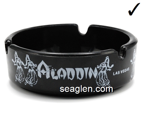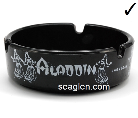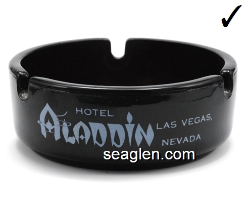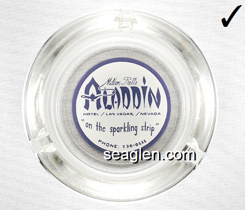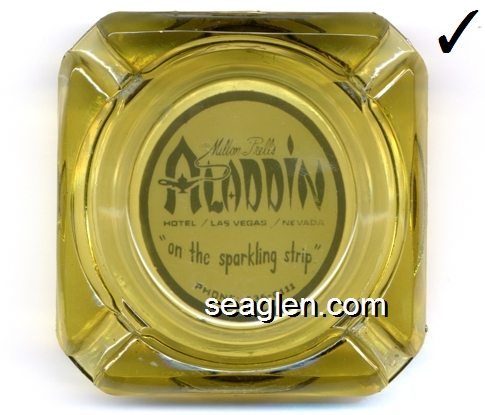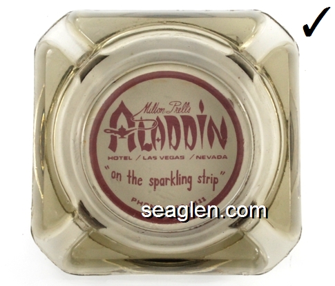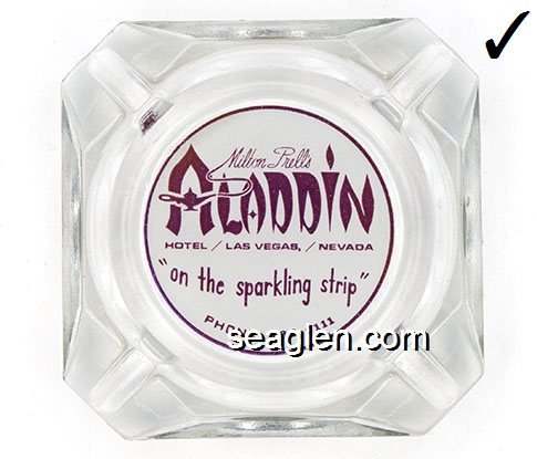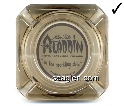 ALA-02 Aladdin Hotel-Casino Las Vegas, NV 3 1/2" Smoke Glass Ashtray Black on white imprint: Milton Prell's Aladdin Hotel / Las Vegas / Nevada ''on the sparkling strip'' Phone: 736-0111 |