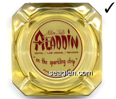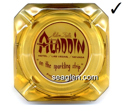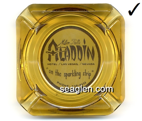 ALA-F1 Aladdin Hotel-Casino Las Vegas, NV 3 1/2" Light Amber Glass Ashtray Maroon on white imprint: Milton Prell's Aladdin Hotel / Las Vegas, / Nevada ''on the sparkling strip'', Phone: 736-0111 |