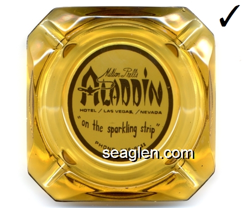 ALA-E3 Aladdin Hotel-Casino Las Vegas, NV 3 1/2" Amber Glass Ashtray Gray on white imprint: Milton Prell's Aladdin, Hotel / Las Vegas, / Nevada, ''on the sparkling strip'', Phone: 736-0111 |