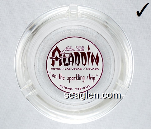 ALA-03 Aladdin Hotel-Casino Las Vegas, NV 3 1/2" Clear Glass Ashtray Maroon on white imprint: Milton Prell's Aladdin Hotel / Las Vegas, / Nevada ''on the sparkling strip'' Phone: 736-0111 |