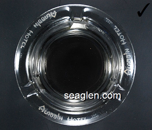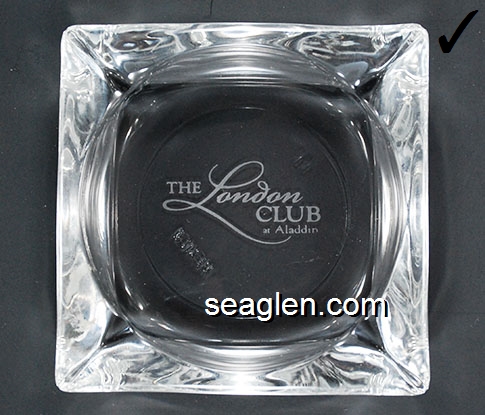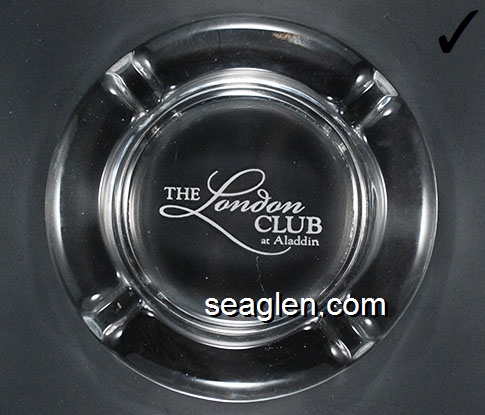 ALA-K1 Aladdin Hotel-Casino Las Vegas, NV 3 1/2" Clear Glass Ashtray Etched imprint: The London Club at Aladdin (MEXICO moulded underside) |