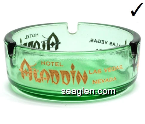 ALA-L2 Aladdin Hotel-Casino Las Vegas, NV 3 1/2" Green Glass Ashtray Gold imprint: Hotel Aladdin Las Vegas, Nevada |