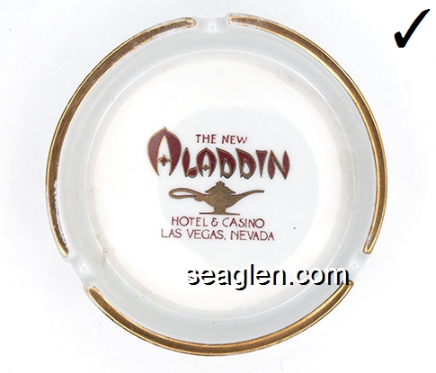 ALA-Q1 Aladdin Hotel-Casino Las Vegas, NV 4 1/8" White Porcelain Ashtray Red and gold imprint: The New Aladdin, Hotel & Casino, Las Vegas, Nevada |