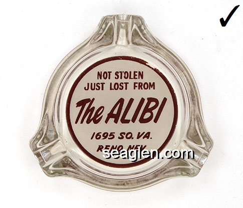 ALI-A1 Alibi Club Reno, NV 3 1/4" Clear Glass Ashtray Red on white imprint: Not Stolen, Just Lost From The Alibi, 1695 SO. VA., Reno, Nev. |