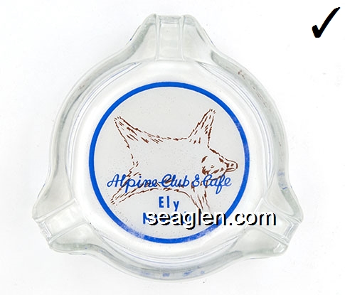 ALP-A1 Alpine Club Ely, NV 3 1/2" Clear Glass Ashtray Blue and yellow on white imprint: Alpine Club & Cafe, Ely, Nevada |