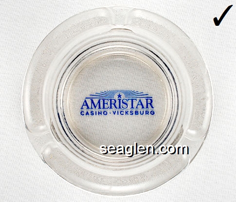 AMV-A2 Ameristar Casino (Vicksburg) Vicksburg, MS 4 1/2" Clear Glass Ashtray Blue imprint: Ameristar Casino - Vicksburg |