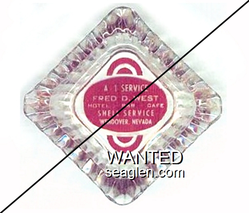 AOC-A1 A-1 Service Casino & Cafe West Wendover, NV 4 1/2" Clear Glass Ashtray White on red imprint: A - 1 Service, Fred D. West, Hotel - Bar - Cafe, Shell Service, Wendover, Nevada |