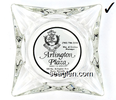 ARP-A1 Arlington Plaza Motor Hotel Reno, NV 4 1/2" Clear Glass Ashtray Black on white imprint: (702) 786-3226, Wm. Di Cristina Manager, Arlington Plaza, Above the Ordinary, 100 No. Arlington Ave., Reno, Nevada |