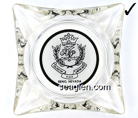 ARP-A2 Arlington Plaza Motor Hotel Reno, NV 4 1/2" Clear Glass Ashtray Black on white imprint: Arlington Plaza Motor Hotel, Reno, Nevada |