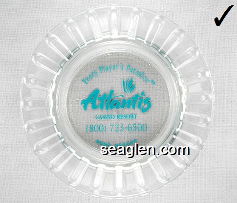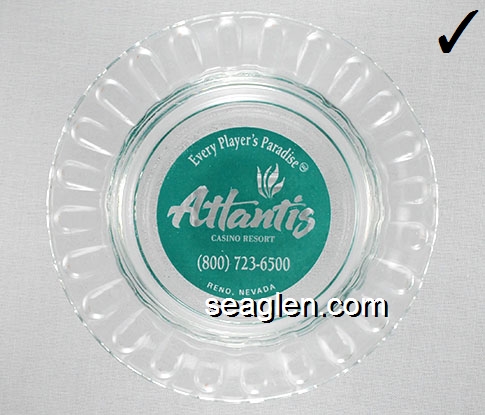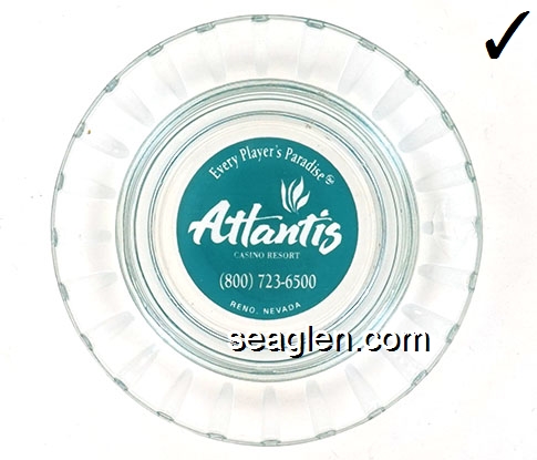 ATL-A1 Atlantis Casino Resort Reno, NV 4 1/2" Clear Glass Ashtray Clear through green imprint: Every Player's Paradise, Atlantis Casino Resort, (800) 723-6500 Reno, Nevada (Style F) |