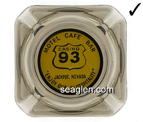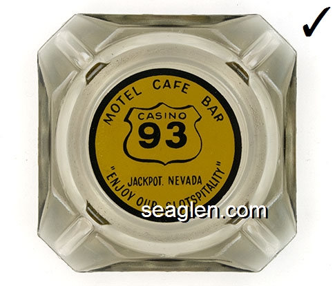 BAC-21 Barton's Club 93 Casino Jackpot, NV 3 1/2" Smoke Glass Ashtray Black on yellow imprint: Motel Cafe Bar, Casino 93, Jackpot, Nevada ''Enjoy Our Slotspitality'' |