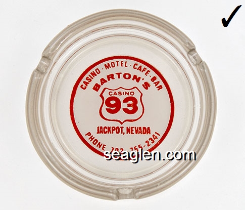 BAC-23 Barton's Club 93 Casino Jackpot, NV 3 9/16" Clear Glass Ashtray Red on white imprint: Casino - Motel - Cafe - Bar, Barton's Casino 93, Jackpot, Nevada, Phone 702 - 755-2341 |