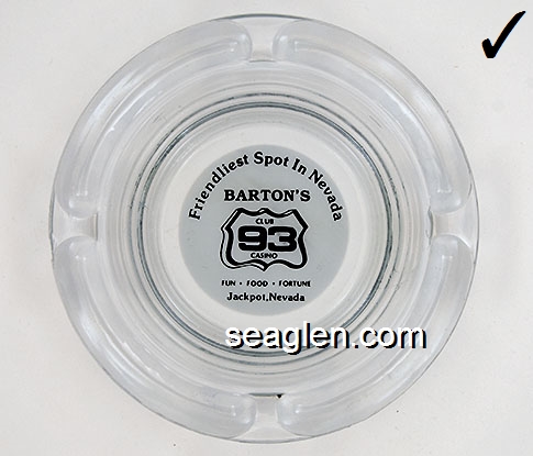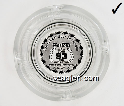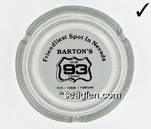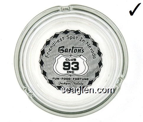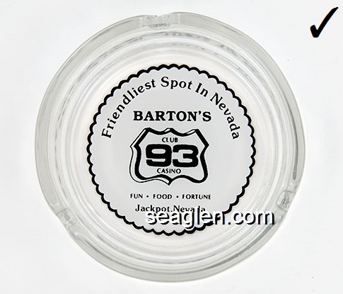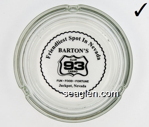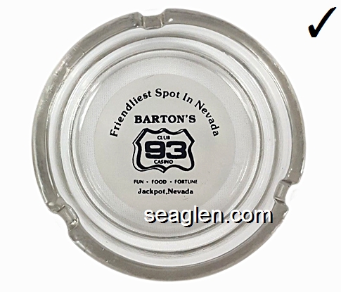 BAC-26 Barton's Club 93 Casino Jackpot, NV 3 1/2" Clear Glass Ashtray Black on white imprint: Friendliest Spot In Nevada, Barton's Club 93 Casino, Fun - Food - Fortune, Jackpot, Nevada |