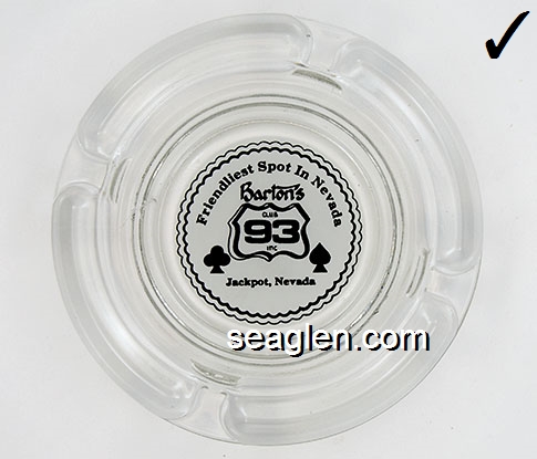 BAC-C2 Barton's Club 93 Casino Jackpot, NV 3 3/4" Clear Glass Ashtray Black on white imprint: Friendliest Spot in Nevada, Barton's Club 93 Casino, Fun - Food - Fortune, Jackpot, Nevada |
